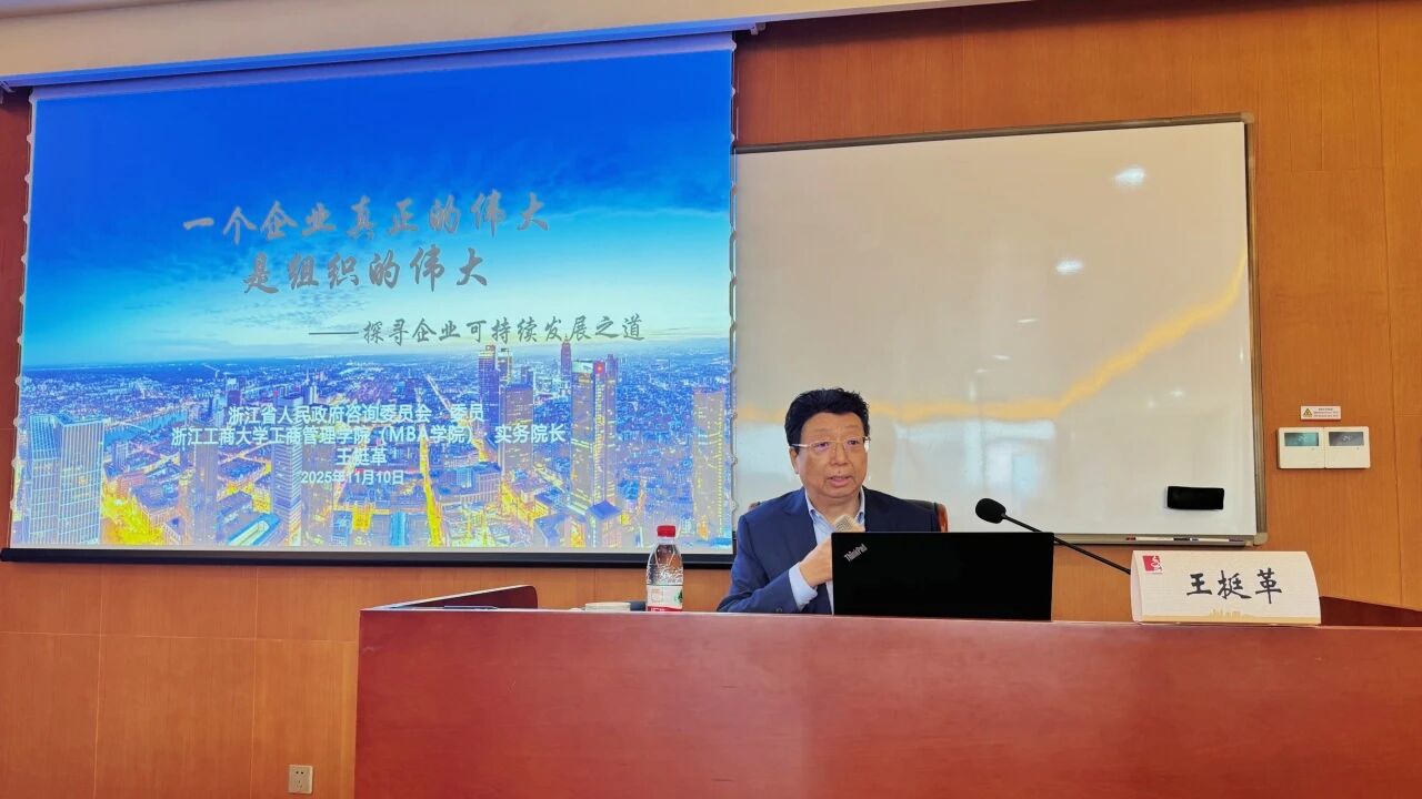 本次研修班突出“政策前瞻、技术融合、管理进阶、人文素养”四大维度,组建了由高校学者、政策专家、企业领军人物构成的师资团队,开展一系列高强度、互动式、案例化的专题讲座:物产中大集团原董事长、党委书记王挺革主题分享《探寻企业可持续发展之道》,围绕“企业组织与可持续发展”核心命题,结合自身深耕企业管理的实战经验,以“一个企业真正的伟大是组织的伟大”为切入点,通过长期主义、利他主义、打造差异化等角度生动剖析了企业长效发展的底层逻辑。
